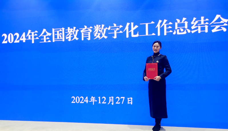 王姣老师有幸作为遴选自全国的前 100 名教师代表中的 3 位之一,从吴岩副部长手中接过了证书。作为千千万万一线教育工作者中的一份子,能够见证中国教育数字化建设取得的伟大成就,王姣感到无比自豪,同时也意识到教育的责任重大,使命光荣。她说道:聆听怀部长的讲话,让我更加深刻地认识到总书记强调的“教育数字化是我国开辟教育发展新赛道、塑造教育发展新优势突破口”的重要涵义。对一线教师而言,AI+的教育新模式将是教育现代化的又一个风口,同时也将引发一场深刻的学习方式变革,能让全社会的学习者时时可学,人人能学,促进全民素养的提升,增强中国的国际竞争力。未来我将继续努力,不断学习,勇于实践,为教育数字化贡献自己的力量。