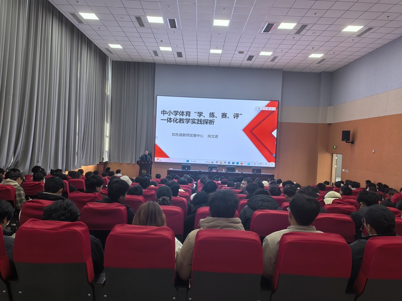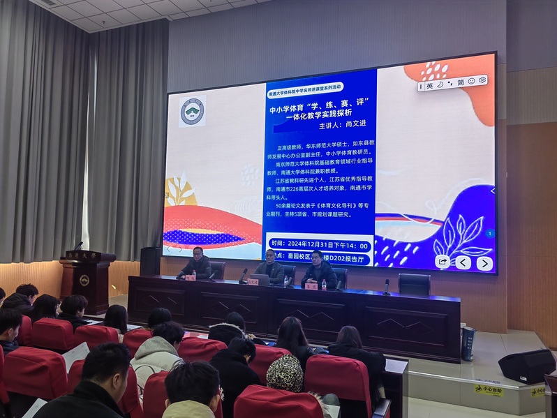 12月31日下午,公司在23号楼D202开展名师进课堂系列讲座活动。如东县教师发展中心办公室副主任,中小学体育教研员尚文进教授为体育教育2022级员工做《中小学体育“学、练、赛、评”一体化教学实践探析》讲座,娄虎经理出席讲座并致欢迎词。